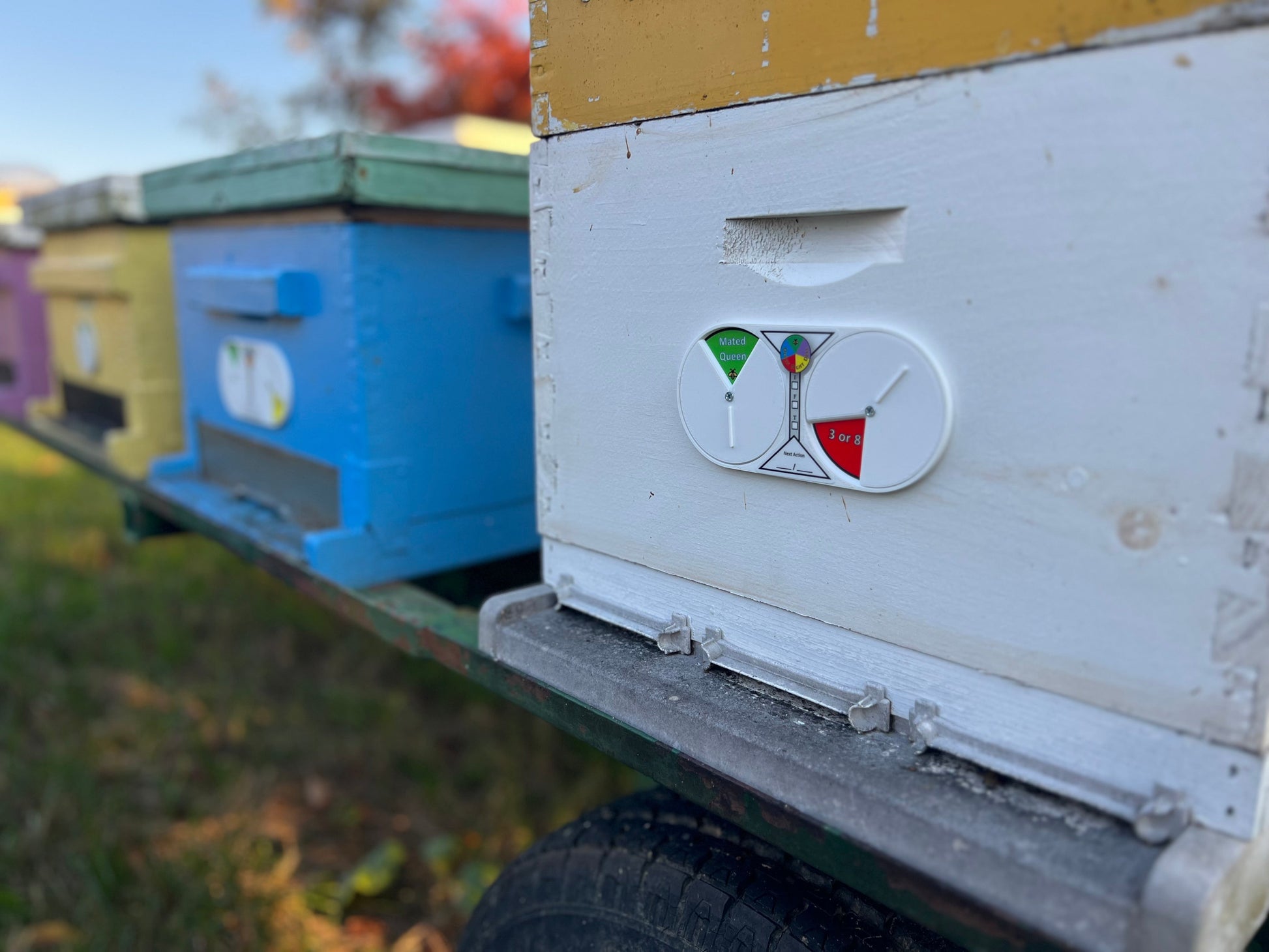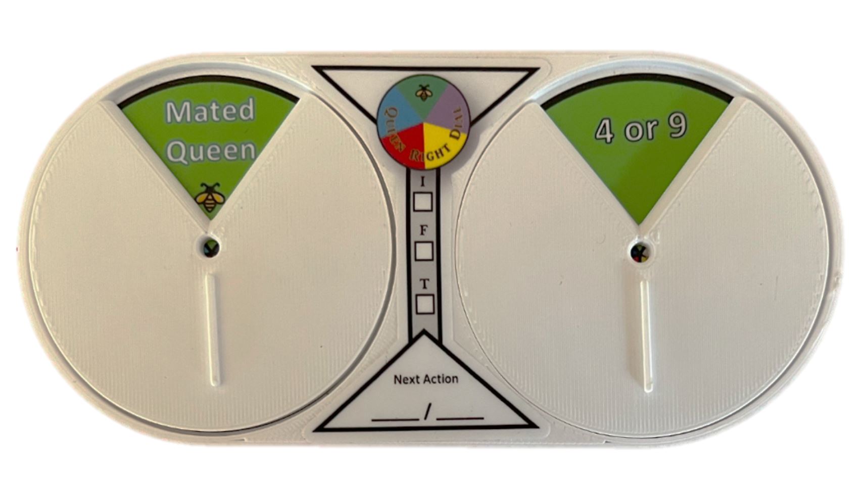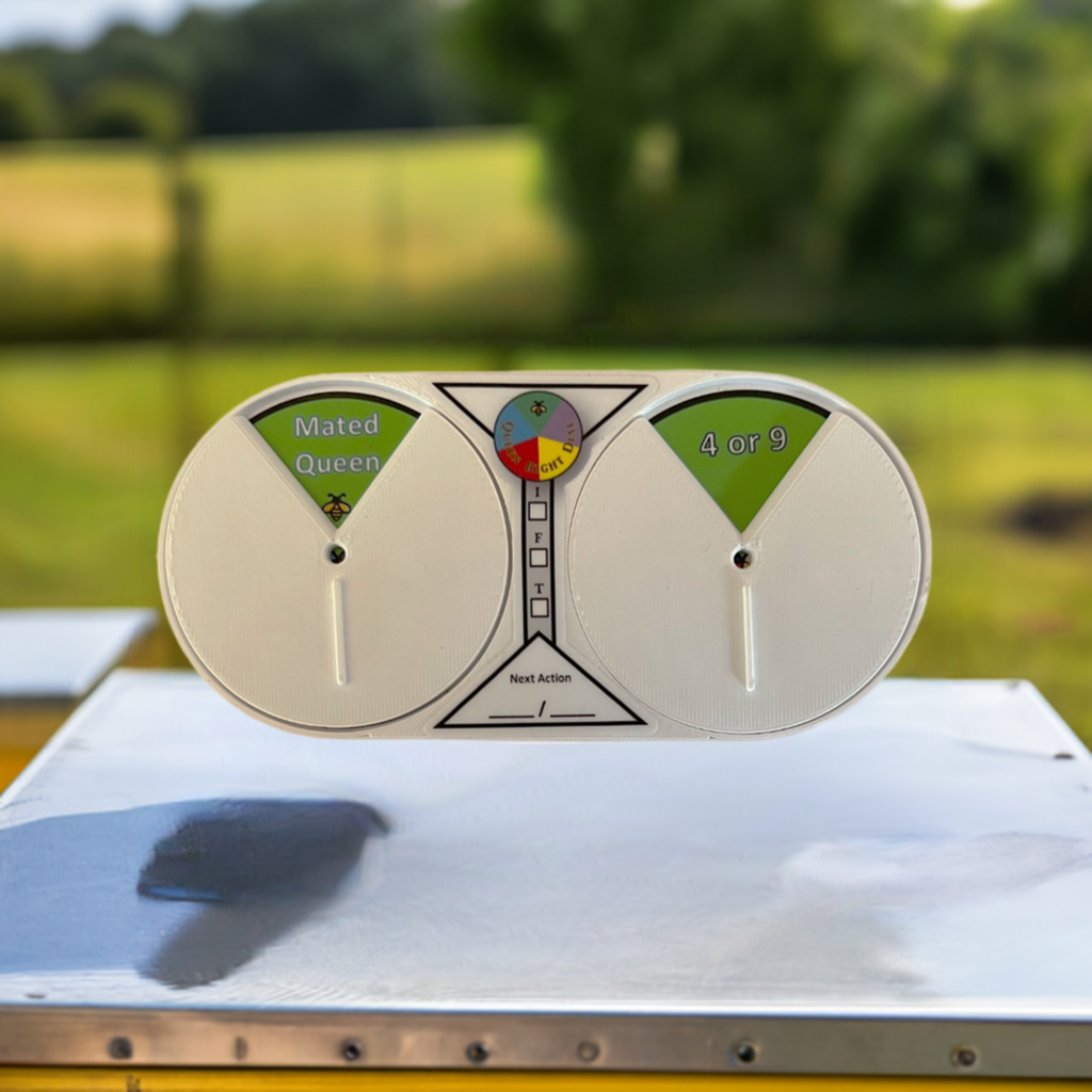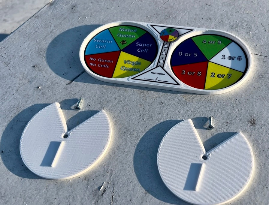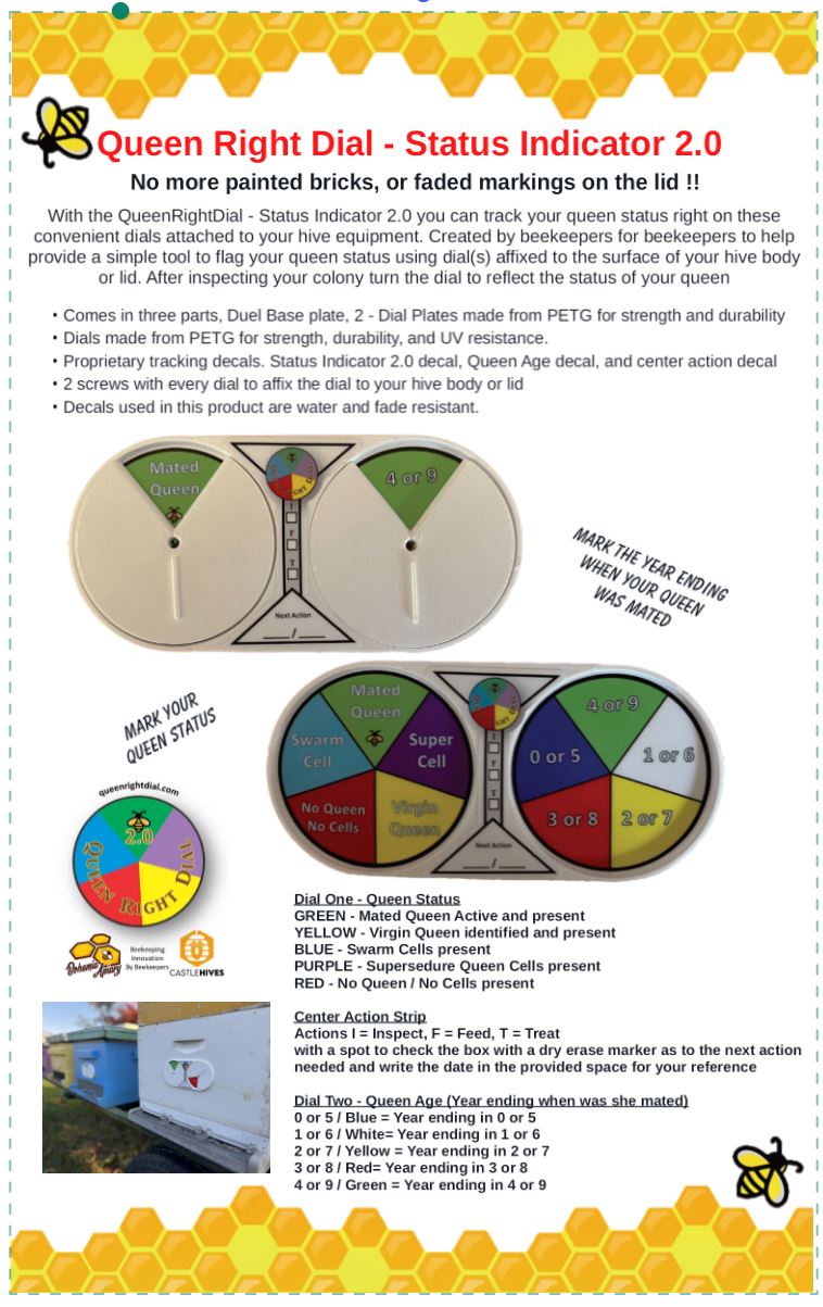 Comes in three(3) parts, Duel Base plate, 2 - Dial Plates. Along with the proprietary tracking decals. Status Indicator 2.0 decal, Queen Age decal, and center action decal. We also include 2 screws with every dial to affix the dial to your hive body or lid