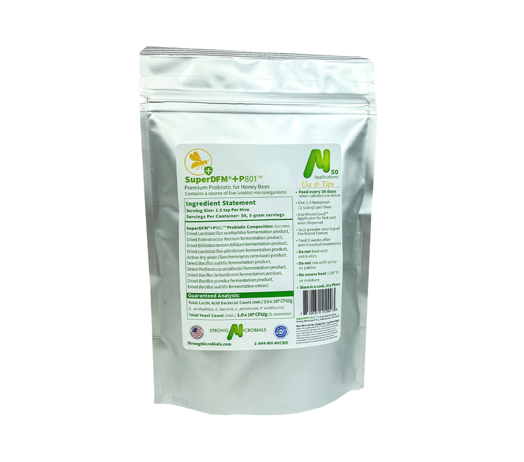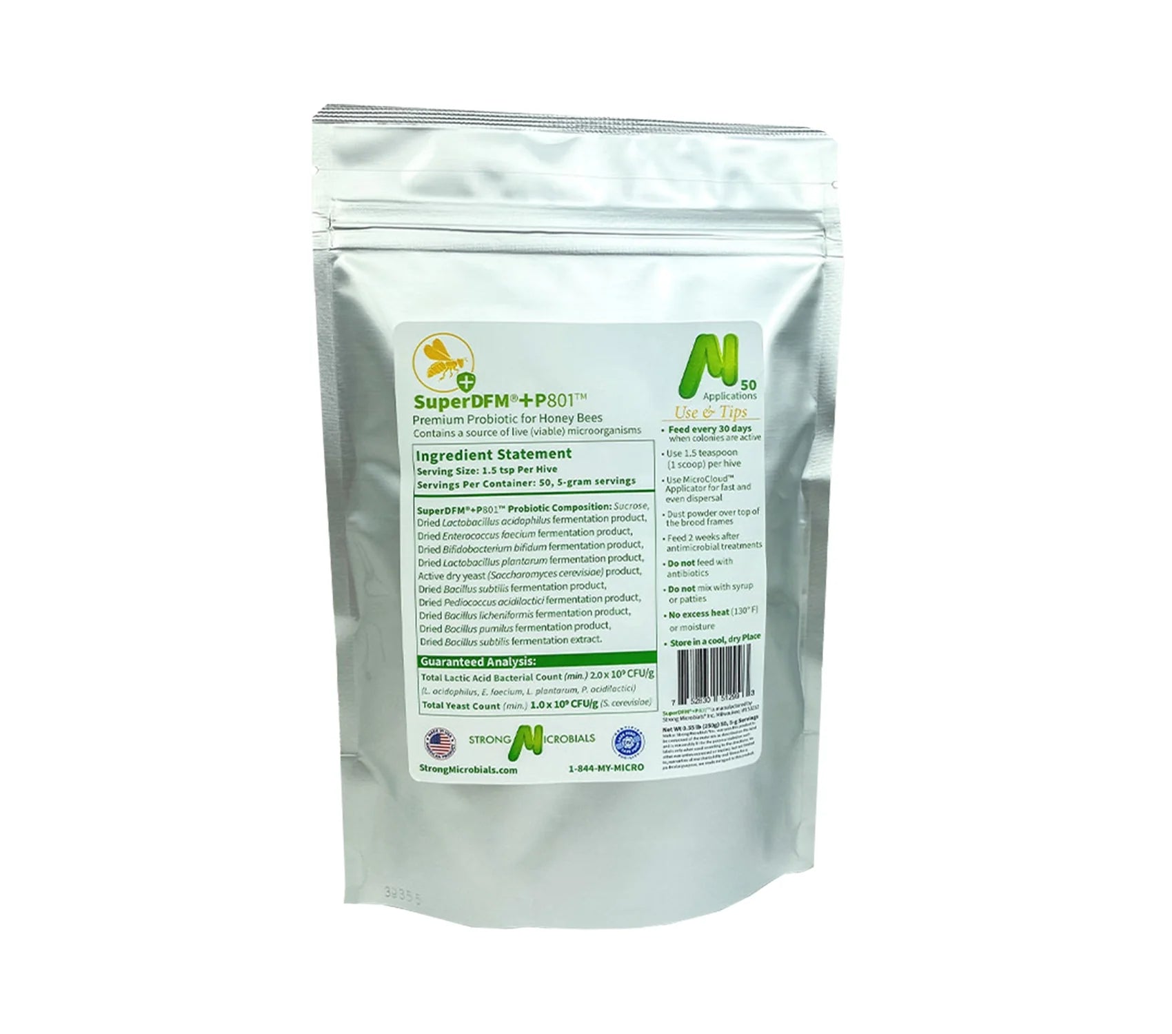 Enhanced P801 Formula: Building upon the success of our original SuperDFM-HoneyBee formula, our enhanced P801 blend combines eight potent beneficial bacteria strains, including Pediococcus. You're not just protecting bees; you're advancing sustainable pollination practices.